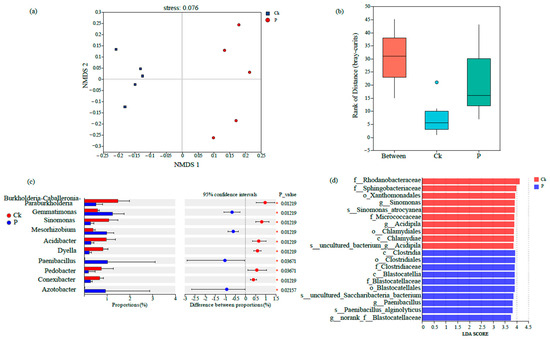 Beta-diversity analysis based on NMDS demonstrated pronounced dissimilarities between groups Ck and P, indicating significant structural divergence in their microbial communities (Figure 4a). Furthermore, inter-group distance box plots (calculated using OTU-level Bray–Curtis dissimilarity) confirmed statistically distinct microbial community structures (p < 0.05, Kruskal–Wallis test) (Figure 4b). Inter-group differential significance testing revealed that the relative abundances of specific bacterial genera, such as Acidibacter, Dyella, Bacillus, Pedobacter, Conexibacter, Azotobacter, Burkholderia-Caballeronia-Paraburkholderia, Gemmatimonas, Sinomonas, and Mesorhizobium, exhibited significant differential abundance between the Ck and P groups (Figure 4c). LEfSe analysis (LDA score threshold > 3.0) identified distinct biomarker taxa: Sinomonas and Acidipila were enriched in Ck, whereas Paenibacillus served as key discriminators for the P group (Figure 4d).