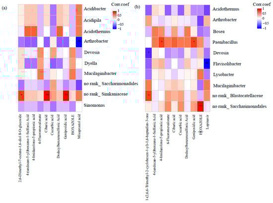 Heatmap-based analysis of correlation networks between rhizosphere bacterial genera and specific chemicals of root exudates for plants either (a) not infected (Ck) with P. brassicae or (b) infected with P. brassicae (P). Asterisks denote statistically significant differences: * p < 0.05; *** p < 0.001.