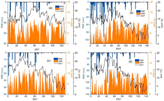 Daily meteorological data for the rice growing season in 2019 and 2020. (a) Daily meteorological data for the 2019 Pukou rice growing season, (b) daily meteorological data for the 2020 Pukou rice growing season, (c) daily meteorological data for the 2019 Liuhe rice growing season, (d) daily meteorological data for the 2020 Liuhe rice growing season; PRE = daily precipitation (mm); DAT = Cumulative daily average temperature above the benchmark of 10 °C; SRH = daily hours of solar radiation; DAY = d after sowing. The data comes from the National Meteorological Information Center of the China Meteorological Administration.