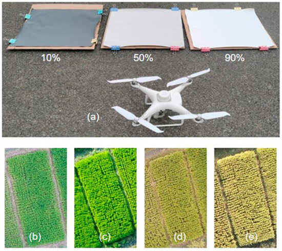UAV platform and radiometric calibration setup. (a) Phantom 4 Professional quadcopter and three diffuse-reflectance calibration panels (10%, 50%, 90% reflectance). The numbers on the panels indicate their certified reflectance values used to convert raw digital numbers to surface reflectance. (b–e) Representative RGB photographs of rice at jointing, flowering, filling and maturity stages, respectively.