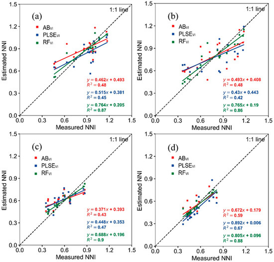 AB, PLSR and RF were used to establish NNI estimation models for different growth periods based on UAV-VIs and measured rice NNI. The validation results of the models are shown in Figure 4. The accuracy of the ABVI and PLSRVI models was relatively low in jointing, flowering and filling stages, with an R2 of less than 0.5, while the validation accuracy of the RFVI model was good in all four growth stages, with an R2 of around 0.85. For different growth stages, the three models performed better in the rice maturity stage, with the validation accuracy of the AB model being 0.59 and that of the PLSR model being 0.67, which was significantly better than the first three growth stages. The performance of the RFVI model was also stable with an R2 of 0.88. Overall, the RFVI model was the most accurate and best-performing model among the rice NNI estimation models established using UAV-Vis. Furthermore, among all growth periods, the model established at maturity demonstrated the highest estimation accuracy.