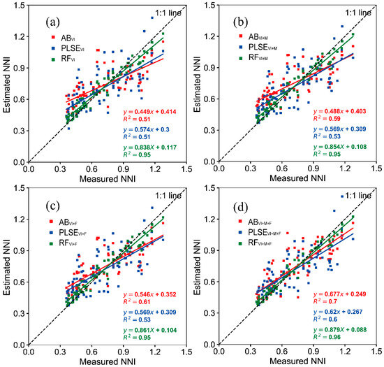 VI, VI + M, VI + F and VI + M + F at the across-stage were used as input factors, and the rice NNI estimation models were established using AB, PLSR and RF algorithms. Figure 5 shows the validation results of the models established using different input factors, and it was found that the NNI estimation model established using VI factors showed the lowest model accuracy compared with the model established by combining meteorological and fertilization factors. When meteorological data were added for modeling, the accuracy of the AB and PLSR models were improved, with an R2 of 0.59 and 0.53, and there was no change in the RF model. Compared with the model established by combining VI and meteorological factors, the AB model incorporating fertilization factors was slightly improved, with an R2 of 0.61, and the accuracy of the PLSR and RF models did not change. Then meteorological data and fertilizer factor were added for modeling, and it was found that the accuracy of the AB model and PLSR model showed a significant improvement, with the an R2 of greater than 0.6, which indicated that the amount of fertilizer application had a significant effect on rice NNI, and this variable factor played an important role in improving the accuracy of the rice NNI estimation model. Compared with both AB and PLSR models, the improvement of RF model accuracy was small or almost no change when incorporating meteorology and fertilization factors; this might be because the validation accuracy of the RF estimation model established by using VIs was already as high as 0.95, and the addition of other variable factors had a limited effect on the improvement of model accuracy. Figure 5 shows the model established by combining VI, meteorological and fertilizer application factors. R2 was 0.96, indicating that the RF model built by combining multivariate factors could still improve the modeling accuracy. Therefore, it was concluded that the RF model (RFVI + M + F) established by combining VI, meteorological and fertilizer application factors was the optimal model for rice NNI estimation. Notably, the integration of meteorological and fertilization variables significantly improved NNI estimation accuracy—particularly at the jointing stage, where UAV-derived VIs alone exhibited limited predictive capacity—providing critical support for timely nitrogen management interventions.