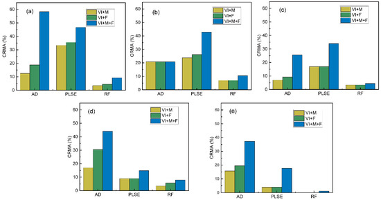 Change rate of model accuracy (CRMA) achieved by adding meteorological (M) and/or fertilization (F) variables relative to the VI-only baseline for (a) jointing, (b) flowering, (c) filling, (d) maturity and (e) across-stage.