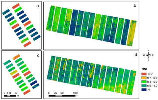 Spatially explicit NNI maps generated by the RFVI+M+F model at the jointing stage for (a) Pukou 2019, (b) Luhe 2019, (c) Pukou 2020, (d) Luhe 2020. Warmer colors indicate higher NNI (N sufficiency); cooler colors indicate lower NNI (N deficiency).