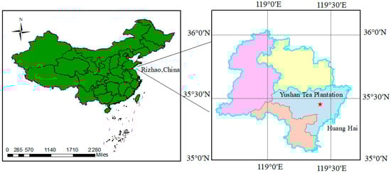 Location of study site. Note: Geographic location of the study area. The left panel shows the location of Rizhao City, China, and the right panel shows the distribution of administrative regions in the study area, with different colors indicating different administrative boundaries. The red star denotes the Yushan Tea Plantation.