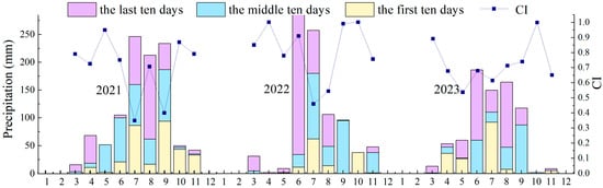 To reveal the temporal distribution characteristics of rainfall in the study area, monthly 10-day rainfall totals and the corresponding CI were calculated for the years 2021 to 2023. The CI ranges from 0 to 1, with higher values indicating that rainfall was concentrated in a single 10-day period, while lower values suggest a more even distribution across the month (Figure 2).