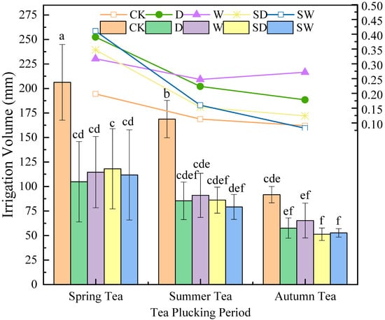 A statistical analysis was conducted on the irrigation volumes of five treatments (CK, D, W, SD, SW) across three harvesting stages—spring, summer, and autumn—from 2021 to 2023 (Figure 3). Among all treatments, the control (CK) consistently exhibited the highest irrigation volumes in each season, reaching 215.97 mm in spring, 168.75 mm in summer, and 91.67 mm in autumn. These results reflect the typical water demand pattern of tea plants under conventional management. All other treatments effectively reduced irrigation amounts to varying extents. Specifically, during the spring tea season, irrigation amounts were reduced from 215.97 mm in CK to 104.86 mm (D), 114.58 mm (W), 118.06 mm (SD), and 111.81 mm (SW). In the summer season, irrigation amounts under the water-saving treatments ranged from 85.42 mm (D) to 79.17 mm (SW), compared to 168.75 mm in CK. During the autumn season, irrigation further declined across all treatments, with CK at 91.67 mm and the lowest value observed in SW (52.78 mm). Overall, seasonal irrigation followed the trend of spring > summer > autumn, which aligns with the phenological water requirements of tea plants under northern climate conditions.