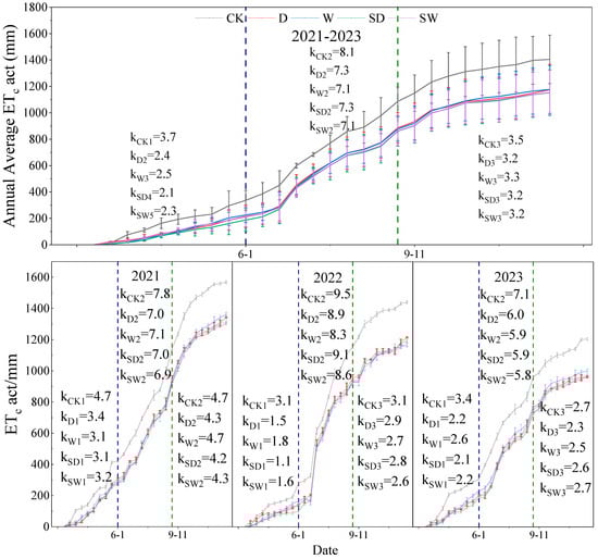 From the perspective of multi-year average cumulative ETc act, the SW treatment exhibited the lowest value (1153.84 mm), followed by D (1173.92 mm) and W (1176.79 mm) (Figure 4). Across all treatments, spring ETc act was relatively low, and the CK treatment showed significantly higher ETc act than other treatments, with an average daily ETc act of 3.7 mm/day. In contrast, differences among the water-saving irrigation treatments were not statistically significant. The overall variation in ETc act among treatments during spring was small, with limited standard error, indicating similar soil moisture conditions across treatments in this season.