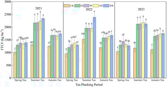 To investigate the impact of different irrigation treatments on FTLY, yield data from spring, summer, and autumn tea seasons in a Rizhao tea plantation were analyzed for the period 2021–2023 (Figure 5). Distinct seasonal variations in FTLY were observed, with summer tea generally producing higher FTLY than spring and autumn tea. This pattern can be attributed to the physiological characteristics of tea plants, including enhanced photosynthesis and accelerated bud development under high-temperature and high-humidity conditions. Yields of autumn and spring tea were relatively similar, following a general order of summer > autumn > spring, indicating that summer tea is most sensitive to water availability and offers the greatest potential for yield enhancement.