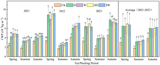 Analysis of CWP of tea under different treatments. Note: “Average (2021–2023)” represents the average value across the three experimental years. Error bars represent the standard deviation (n = 3). Different lowercase letters (a–f) indicate significant differences between treatments within the same season at p < 0.05 level based on the LSD test.