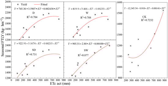 To investigate the overall relationship between ETc act and seasonal FTLY under different irrigation treatments, this study integrated spring, summer, and autumn yield and ETc act data and performed a quadratic regression analysis across the five treatments (Figure 7). The results revealed a significant nonlinear relationship between seasonal yield and ETc act. Under the micro-irrigation treatments (D, W, SD, and SW), the yield exhibited an increasing-then-decreasing trend in response to ETc act. The fitted regression curves and corresponding coefficients of determination (R2 ranging from 0.7232 to 0.877) indicated that ETc act is a key driver of seasonal yield variability in tea plantations.