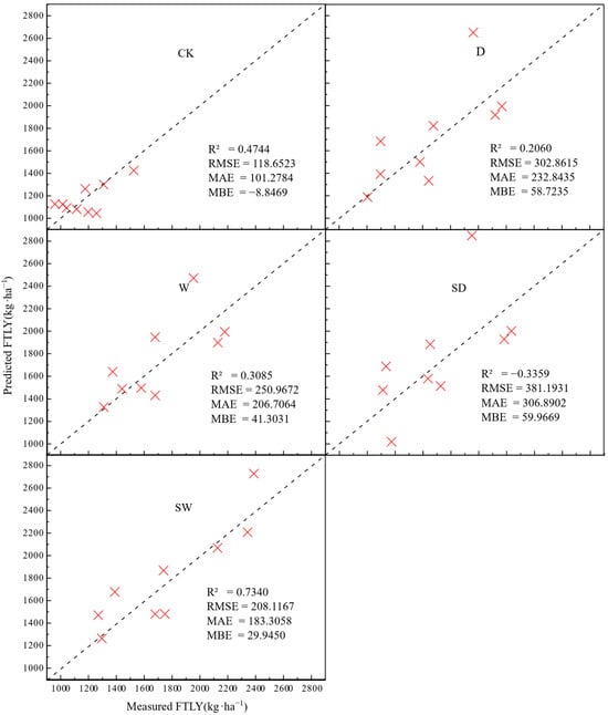 To evaluate the performance of the regression model in predicting FTLY under different irrigation treatments, an LOOCV approach was employed for five irrigation strategies (Figure 8). Among all treatments, the SW treatment (straw mulching combined with drip irrigation) exhibited the best performance, with an R2 of 0.87, and RMSE and MAE values of 289.28 and 260.34 kg/ha, respectively. This indicates a high level of agreement between predicted and observed values, reflecting strong model stability and reliability. In contrast, the SD treatment demonstrated the lowest model accuracy, with a negative R2 (−0.24) and a high RMSE of 339.77 kg/ha, suggesting that the model failed to adequately capture yield variations under this irrigation regime and performed worse than simple mean-based predictions.