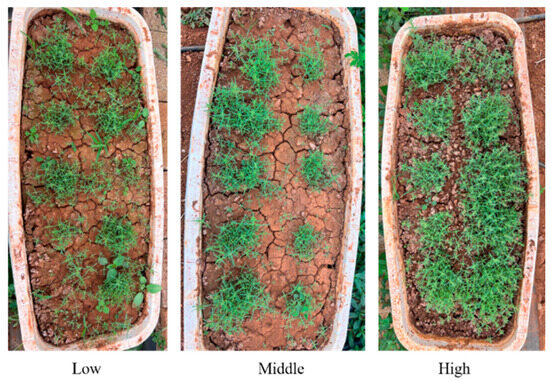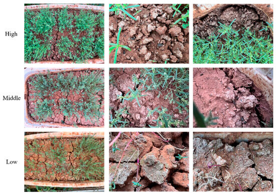 This paper uses camera images to construct a dataset containing 3450 high-resolution (1024 × 1024) soil salinization images, covering three categories of soil salinization images: ‘high’, ‘medium’, and ‘low’. Each category contained 1150 samples, captured from multiple angles and locations in each basin over the same two-month period to account for visual differences, with no adjustment for magnification. The specific information of the dataset is shown in Table 1, which divides the image of each degree of salinization into a training set, a validation set, and a test set. A total of 850 images (2550 in total) of each salinity category were used as the training set, 200 images (600 in total) were used as the validation set, and 100 images (300 in total) were used as the test set. In high-salinity soil, Suaeda glauca grows lusher, resulting in different shapes and sizes of bare soil. In medium-salinity soil, with the improvement of Suaeda glauca, it will become similar to low-salinity soil (original soil), which brings challenges to the collection and classification tasks of datasets. The example of datasets is shown in Figure 2.