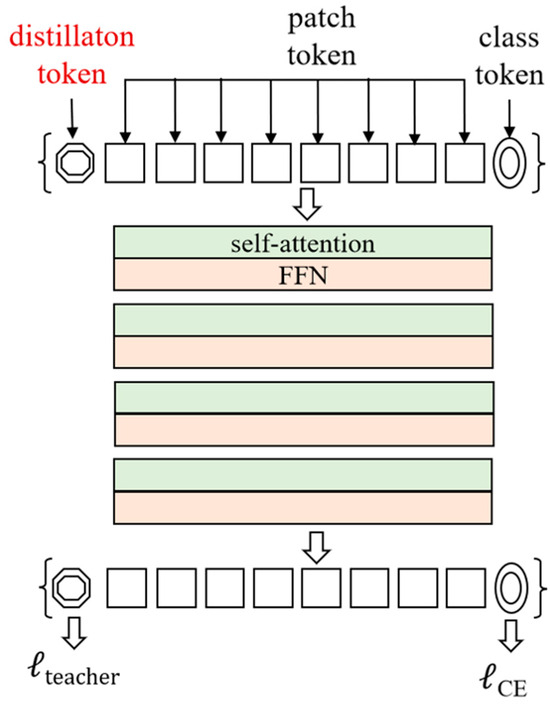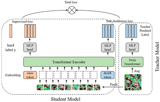 Distillation loss: There are two types of distillation: soft distillation and hard distillation. Soft distillation minimizes the Kullback–Leibler loss of softmax for both teacher and student models. The soft distillation equation is shown in Formula (3).