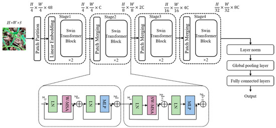 Swin Transformer is a successful example of applying a sequential data processing approach from natural language processing (NLP) [28] analysis to the field of computer vision [29]. Figure 4 illustrates the overall architecture of the Swin Transformer. Swin Transformer is adopted in our framework as the base model due to its ability to capture both local and global spatial features through hierarchical window-based self-attention. In our implementation, the input image is divided into non-overlapping 4 × 4 patches, which are treated as tokens. These tokens are passed through a series of Swin Transformer blocks with alternating window-based (W-MSA) and shifted window-based (SW-MSA) multi-head self-attention mechanisms. Comparison of the computational volume of MSA and W-MSA:
