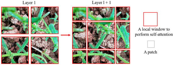 In our implementation, RGB images are first divided into 4 × 4 patches and linearly embedded into tokens. These tokens pass through four stages of Swin Transformer blocks, each responsible for extracting features at progressively coarser spatial resolutions. The sliding window mechanism, combined with multi-scale hierarchical design, enables effective modeling of both fine-grained salt textures and large-scale spatial salinity patterns, which are critical for accurate classification in complex field environments. The sliding window strategy is illustrated in Figure 5.