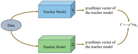 Equation (3) defines as the logarithm of the teacher model and as the logarithm of the student model. KL represents the Kullback–Leibler divergence and balances the loss between the Kullback–Leibler divergence (KL) and the loss of cross-entropy (LCE) of the ground truth label y. The softmax function is denoted as , and the distillation temperature is denoted as .