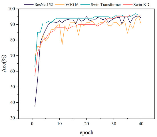 This experiment was run under the Unbantu 22.04.2 LTS operating system using the PyTorch 1.9.0 and CUDA 1.1.0 frameworks. The hyperparameter setting is crucial for achieving good performance in model training. The initial learning rate is set to 1 × 10−5 (i.e., 0.00001), and it decreases exponentially after 20 rounds of training until the minimum learning rate of 1 × 10−9 is reached. The weight_decay is set to 1 × 10−4 and the random seed is set to 42. In addition, after many experiments and reference-related research, the AdamW [45] optimizer was finally used to train the model. The data for each round of training (batch _ size) is 64, and the entire model is trained for 40 rounds. Finally, the alpha was set to 0.5 for distillation, and the distillation temperature was set to 1 after the experiment. By setting these hyperparameters, the model can be trained quickly, stably, and efficiently, so as to obtain better classification results.
