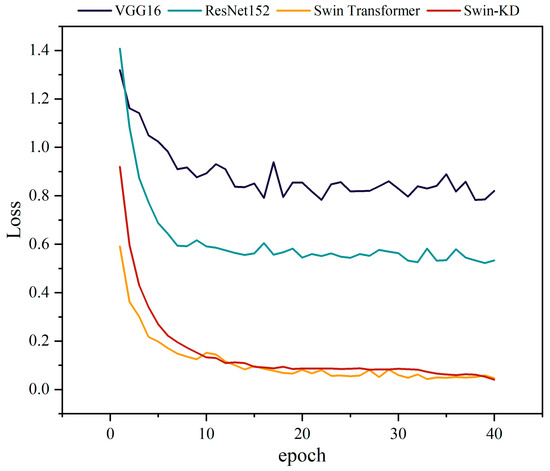 Based on the changes in loss values over 40 training epochs (Figure 9), the models exhibited varying levels of convergence and optimization ability. The ResNet152 model demonstrated a rapid initial decline in loss, stabilizing below 0.6 after 10 epochs and fluctuating between 0.5 and 0.6 thereafter. This plateau suggests limitations in modeling small or edge saline regions due to their fixed receptive field. In contrast, VGG16 exhibited the slowest convergence, with loss values remaining around 0.8 throughout training. Its sequential convolution layers struggle to capture low-contrast differences between salt and soil background, leading to insufficient spatial sensitivity and slower learning progression. In comparison, both Swin Transformer and Swin-KD achieved significantly lower loss values—dropping below 0.2 within the first five epochs and ultimately reaching values under 0.05. Swin Transformer displayed rapid early decline with minor fluctuations, attributed to its hierarchical self-attention mechanism, which effectively captures multi-scale spatial patterns and relationships through local and shifted windows. The Swin-KD model further improved stability, showing a sharp initial decline followed by a smooth, fluctuation-free downward trend, reflecting superior optimization capacity. This consistent loss reduction highlights Swin-KD’s robust adaptability to complex training data. Overall, Swin-KD outperformed the other models in convergence speed, optimization efficiency, and training stability, underscoring its suitability for precise salinity classification under challenging visual conditions.