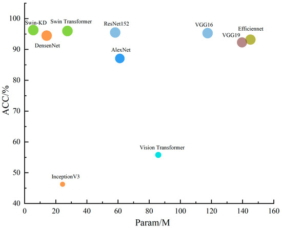 In order to prove the generalization performance of the algorithm, we have performed experiments on the public dataset ImageNet-1K. Table 5 compares the classification accuracy (Acc) and model complexity (measured by parameter count) of various architectures on the ImageNet-1K dataset. In order to prove the generalization performance of the algorithm, we have conducted experiments on the public dataset ImageNet-1K. Table 5 compares the classification accuracy (Acc) and model complexity (measured by parameter count) of various architectures on the ImageNet-1K dataset. Traditional CNN models, such as VGG16 and VGG19, show relatively low accuracies of 71.3% and 71.6%, respectively, despite having very large parameter sizes of 138.4M and 143.7M. This indicates inefficiency in representation. In contrast, lightweight architectures like EfficientNet and MobileNetV3 achieve higher accuracies of 77.1% and 75.2%, respectively, with significantly fewer parameters of 5.0M and 5.4M, reflecting better parameter efficiency. Transformer-based models also show strong performance, with the Swin Transformer reaching 81.3% accuracy with 27.5M parameters. Notably, the proposed Swin-KD model achieves the highest accuracy of 81.8% with only 5.53M parameters, outperforming both the Swin Transformer and other lightweight models. This highlights the effectiveness of knowledge distillation in enhancing performance while maintaining a low computational cost, making Swin-KD highly suitable for resource-constrained deployment scenarios without sacrificing accuracy.