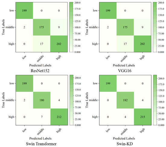 Figure 11 presents the confusion matrices of four models on the test set, revealing not only performance differences but also structural limitations in handling varying degrees of soil salinity. All models achieved perfect classification on low-salinity (original) soil, indicating strong discrimination of non-salinized regions. However, classification accuracy dropped for medium- and high-salinity soils, exposing each model’s weaknesses. ResNet152 misclassified 17 high-salinity samples as medium-salinity, reflecting its limited ability to capture spatial transitions due to its fixed receptive field and lack of fine-grained edge sensitivity. VGG16, though slightly better, showed misclassifications likely caused by sensitivity to lighting artifacts and specular reflection, highlighting its limited robustness in complex imaging conditions. The Swin Transformer improved classification through multi-scale attention but still misjudged boundary zones, suggesting insufficient local continuity modeling despite global attention. Swin-KD achieved the highest accuracy, reducing misclassifications to only four high-salinity samples, and demonstrated better handling of ambiguous regions. However, its reliance on distilled knowledge raises questions about its adaptability to unseen data distributions. These results suggest that while transformer-based models outperform CNNs in salinity classification, challenges remain in boundary detection, scale sensitivity, and real-world generalizability.