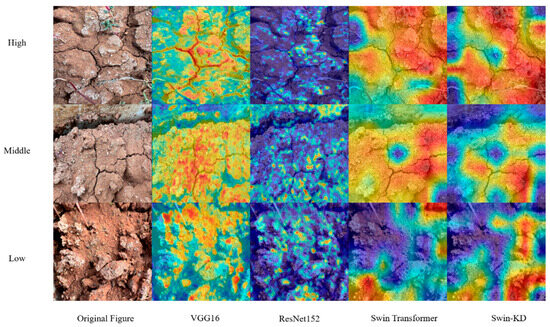 In summary, the Swin-KD model can improve the classification accuracy of soil salinity, significantly improve the model size, and better meet practical production needs regarding classification efficiency and generalization performance. The Swin-KD model has significantly fewer parameters than others, with just 5.3 M. Considering model accuracy, our proposed model also outperforms other models slightly, achieving a 96.3% accuracy. From the class activation mapping diagram, our proposed model focuses more on soil gullies and salinization of the soil surface. Therefore, our model is generally superior in classifying and identifying the degree of soil salinization.