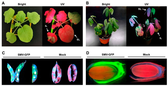 GFP expression in SMV-GFP-inoculated (A) Nicotiana benthamiana at 10 days post-inoculation (dpi), (B) susceptible soybean cultivar SN14 at 10 dpi, (C) pod, and (D) seed in maturation stage. IL: inoculated leaf; SL: non-inoculated systemic leaf.