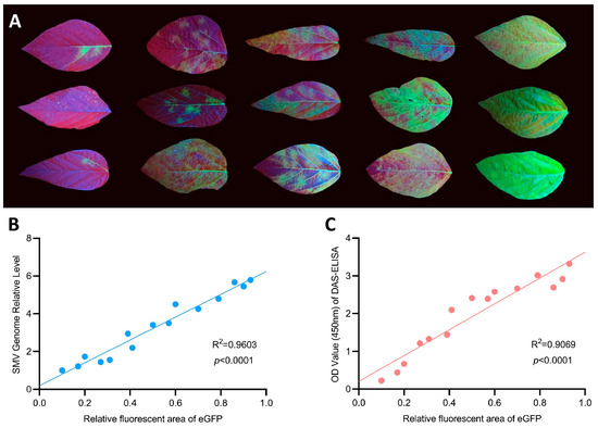 In order to determine whether green fluorescence can be used to quantify SMV-GFP content in soybean leaves, we proposed the concept of RFA that is defined as the ratio of fluorescent area to the total leaf area and can be calculated using ImageJ software through pixelated analysis. A total of 15 soybean leaves with varying RFA values were randomly selected (Figure 3A), and the relative levels of genomic RNA and viral protein of SMV-GFP in these samples were measured by qRT-PCR and DAS-ELISA, respectively. The correlation analysis results showed that the RFA values exhibited a significantly positive correlation (p < 0.0001) with both the viral genomic content (R2 = 0.9603) (Figure 3B) and viral protein content (R2 = 0.9069) (Figure 3C). It was indicated that the RFA value can be used to characterize the viral load in soybean leaf samples.