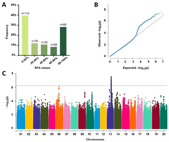 Genome-wide association study (GWAS) for soybean mosaic virus (SMV) resistance. (A) Frequency distribution of the relative fluorescence area (RFA) values of 286 soybean germplasm resources. (B) Quantile–quantile plot of GWAS result. (C) Manhattan plot of GWAS result. The horizontal red line indicates the significance threshold (−log10P = 6.24).