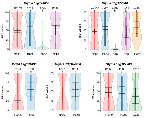 Differences in the relative fluorescence area (RFA) values among accessions carrying different predominant haplotypes of Glyma.13g176600, Glyma.13g177000, Glyma.13g184800, Glyma.13g184900, and Glyma.13g187900. Different letters indicate significant differences (p < 0.05) among groups.