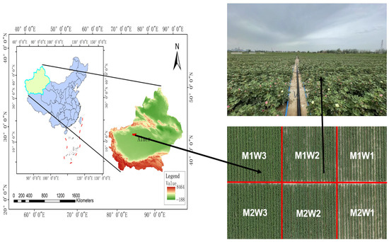 Cross-sectional schematic of the experimental cotton field. M1W1 to M2W3 represent six different experimental treatments.