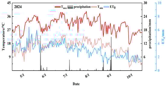 The experiment was conducted at the Xinjiang Alar (Figure 1 Modern Agricultural Comprehensive Experimental Station (81°17′56.52″ E, 40°32′36.90″ N, elevation 1014 m). The test site is located in the plain desert oasis near the confluence of the Aksu River, the Hetian River, and the Yarkand River. It has an extreme continental arid desert climate in the warm temperate zone, with scarce rainfall, intense evaporation, and a large temperature difference between day and night. The diurnal variation characteristics of major meteorological factors during the cotton growing season in 2024 are shown in Figure 2. The proportions of clay, silt, and sand in the 0–100 cm soil layer of the experimental area were 0.21%, 15.06%, and 84.81%, respectively, indicating a sandy loam soil texture. The soil saturated water content was 0.30 cm3·cm−3, the field capacity was 0.25 cm3·cm−3, and the bulk density was 1.57 g/cm3. The basic soil nutrients indicators are shown in Table 1.