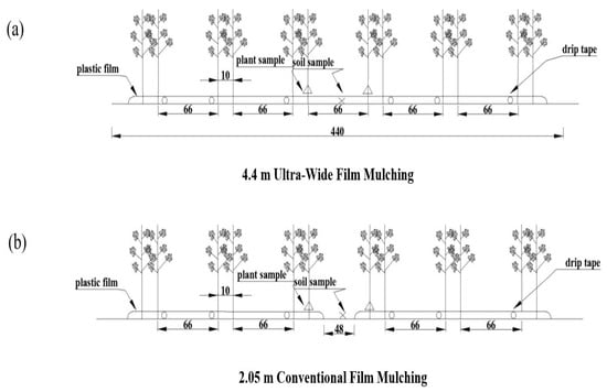 Schematic diagram of cotton planting patterns and drip irrigation tape layout. (a) 4.4 m ultra-wide film; (b) 2.05 m conventional film.