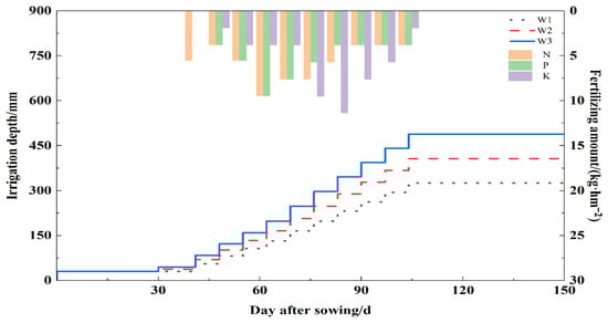 Irrigation and fertilization regime during the cotton growth period in 2024. W1 to W3 represents three different irrigation depths. N: Urea; P: phosphorus fertilizer; K: potassium fertilizer.
