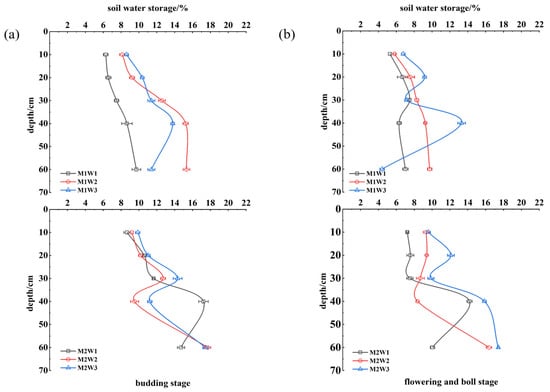 Changes in soil moisture content at different growth stages. (a) Soil moisture variation at 0–60 cm depth during the budding stage; (b) soil moisture variation at 0–60 cm depth during the flowering and boll stage.
