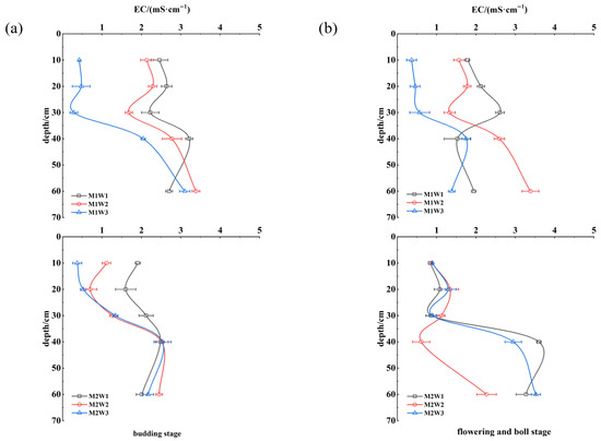 Changes in soil electrical conductivity at different growth stages. (a) Changes in soil EC at 0–60 cm depth during the budding stage; (b) changes in soil EC at 0–60 cm depth during the flowering and boll stage.