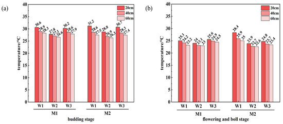 As shown in Figure 7, soil temperature during the bud stage is relatively high, with the temperature at the 20 cm shallow layer significantly higher than that at deeper layers. Under the same irrigation depth, soil temperatures at all depths in the M2 treatment are higher than those in M1, demonstrating better heat retention. At the 20 cm depth during the bud stage, soil temperature under the M2W1 treatment reached 31.2 °C, which was higher than that of M1W1. With increasing irrigation depth soil temperature shows a decreasing trend, with the temperature decline in M2 treatments being slightly less pronounced. Soil temperatures at the 40 cm and 60 cm depths exhibit minor fluctuations. During the flowering–boll stage, overall soil temperatures decreased by 2–3 °C compared to the bud stage, but the 20 cm layer still remained warmer than the deeper layers. At 20 cm depth under M2W1, soil temperature was 28.4 °C, which was higher than M1W1. However, soil temperatures under M2W2 and M2W3 were lower than those under M1W2 and M1W3, respectively.