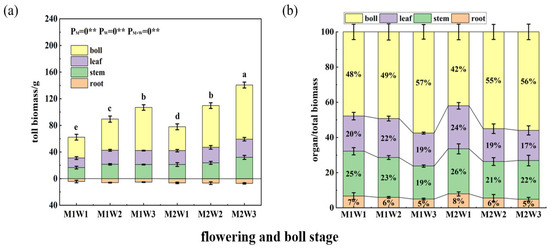 Effects of different treatments on cotton dry matter accumulation and organ distribution ratio. (a): Total dry matter per plant during the flowering and boll stage; (b): proportion of each plant organ during the flowering and boll stage. Different lowercase letters indicate significant differences among treatments at p < 0.05. ** indicates extremely significant differences (p < 0.01).