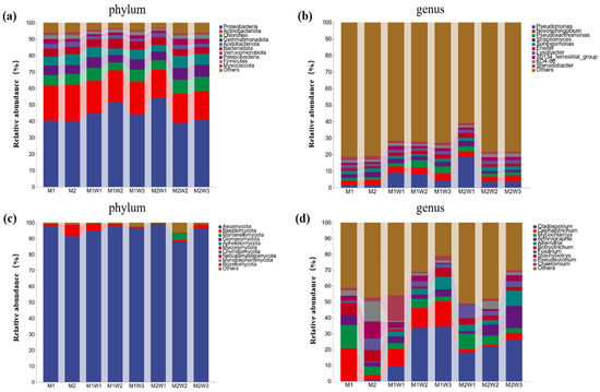 Composition of bacterial and fungal phyla and genera at different growth stages. M1 and M2 represent two mulching widths before the initial irrigation at the budding stage; M1W1–M2W3 represent six different treatments during the flowering and boll stage; (a,b) refer to bacteria, while (c,d) refer to fungi, respectively. At the phylum level the bacterial “others” mainly include Methylomirabilota, Planctomycetota, and Nitrospirota. At the genus level the bacterial “others” mainly include Ilumatobacter, Bacillus, and members of Vicinamibacteraceae. For fungi at the phylum level the “others” mainly consist of some unclassified phyla, while at the genus level the “others” mainly include Botryoderma, Aspergillus, and Cladorrhinum.