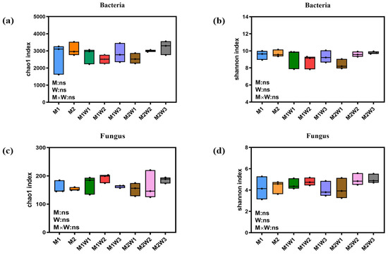 Effects of different growth stages on rhizosphere soil microbial α-diversity. (a) Bacterial Chao1; (b): bacterial Shannon; (c) fungal Chao1; (d) fungal Shannon. Different colors represent different treatments. Among them, blue: M1; Orange: M2; Green: M1W1; Red: M1W2; Purple: M1W3 Brown: M2W1; Pink: M2W2; Grey: M2W3. ns indicates no significant difference (p > 0.05).