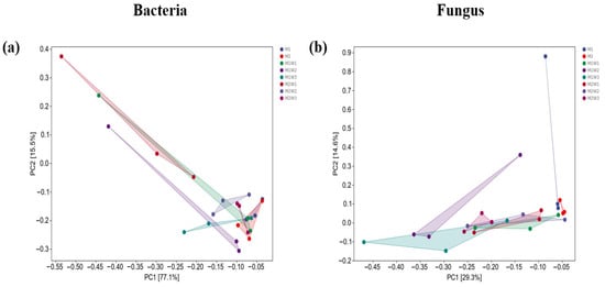 Changes in rhizosphere microbial community β-diversity among different groups. PC1 represents the axis corresponding to the greatest variation in the data, while PC2 represents the second largest variation direction, which is orthogonal to PC1 and captures the remaining variation not explained by PC1, together revealing the core structure of the data. (a) Bacterial beta diversity; (b) Fungal beta diversity. Different colors represent different treatments. Among them, blue: M1; Bright red: M2; Light green: M1W1; Deep purple: M1W2 Dark green: M1W3 Deep red: M2W1; Light purple: M2W2; Dark red: M2W3.