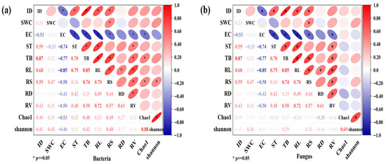 Correlation analysis between rhizosphere microbial α-diversity and soil environmental and growth factors. (a) Correlation analysis between different indicators and bacterial α-diversity; (b) correlation analysis between different indicators and fungal α-diversity. Irrigation depth: ID; soil moisture content: SWC; electrical conductivity: EC; temperature: ST; total biomass: TB; root length: RL; root surface area: RS; root diameter: RD; root volume: RV.