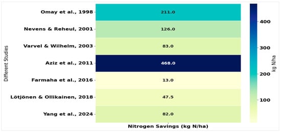 Heatmap of reported nitrogen savings from crop rotations compared to monoculture, based on the field data gathered from different studies [109,115,141,142,143,144,145]. This graph represents a summary of field-based studies quantifying nitrogen savings achieved through crop rotation. The heatmap presents a combination of data from eight sources, highlighting the reduction in nitrogen fertiliser inputs or increases in total soil nitrogen rates across different crop systems.
