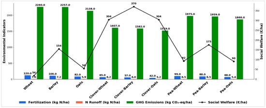 | Nutrient Management | Greater reliance on synthetic inputs; up to 120 kg N/ha in cereals [115]. | Reduces N input: oats = 82 vs. clover–oats = 42 kg N/ha [115]. |