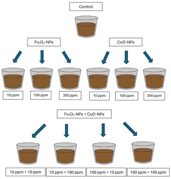 One kilogram of air-dried soil was placed in a plastic pot and watered with deionized water to obtain a humidity of 35%. After 7 days, the soil humidity was checked and replenished in case of losses to maintain the required level of humidity. Next, Fe2O3-NPs and CuO-NPs were added separately as solutions to obtain concentrations of 10, 100, and 300 mg kg−1 soil dry weight. The investigations were also performed in soil samples where Fe2O3-NPs and CuO-NPs were added simultaneously at a concentration of 10 mg kg−1 of Fe2O3-NPs + 10 mg kg−1 of CuO-NPs, 10 mg kg−1 of Fe2O3-NPs + 100 mg kg−1 of CuO-NPs, 100 mg kg−1 of Fe2O3-NPs + 10 mg kg−1 of CuO-NPs, and 100 mg kg−1 of Fe2O3-NPs + 100 mg kg−1 of CuO-NPs. The soil sample without nanoparticles served as control. The experimental design is shown in Figure 1. The soil samples supplemented with nanoparticles were mixed to obtain homogenized samples and were left for stabilization for 14 days, maintaining the soil humidity at 35%, temperature 20 ± 2 °C, with limited light exposure. After the stabilization period, soil samples were subjected to fractionation analysis. Each soil sample (variant of the experiment) was prepared in triplicate.