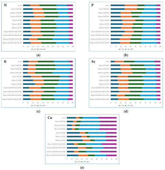 Figure 2a–c presents the concentration of three main nutritional elements (N, P, K) in different soil fractions for untreated soil (control) and soil supplemented by Fe2O3-NPs and CuO-NPs in different concentrations. Figure 2d,e shows the results of Fe and Cu fractionation in different variants of experiment.