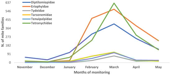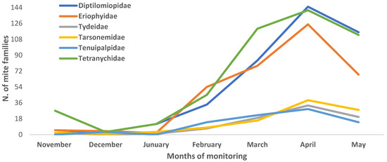 3.1. Relative Abundance and Population Fluctuation of Phytophagous Mite Families in Cultivated Blackberry (Rubus spp. L.)