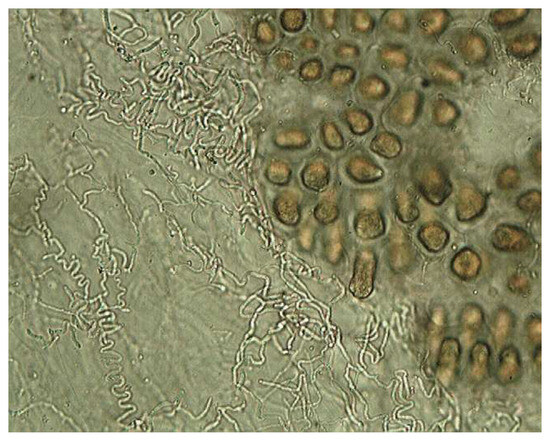 Epichloë fungi are often referred to as “seed-borne fungi” due to their ability to effectively transmit with seeds [6,7,8,9,10,11]. It is important to note that caryopses colonized by these fungi do not show visible symptoms of their presence, which makes visual identification difficult [12]. Epichloë mycelium primarily colonizes the aleurone layer of seeds; however, its distribution in grass caryopses can vary depending on the grass species and endophyte strain (Figure 1).