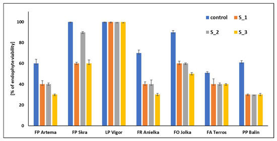 Endophytes colonizing the FP cv. Skra showed a noticeable decrease in viability from the initial value (100%, control) to 60% after storage at both +23 °C and −20 °C but maintained slightly better viability at +7 °C (90%). In FO cv. Jolka, there was also a decrease in endophyte viability across all storage conditions, with the lowest rate observed in the freezer (−20 °C). For most cultivars, storage at −20 °C generally resulted in the lowest or one of the lowest endophyte viability rates (e.g., FP cv. Artema, FR cv. Anielka, FO cv. Jolka, FA cv. Terros, PP cv. Balin).