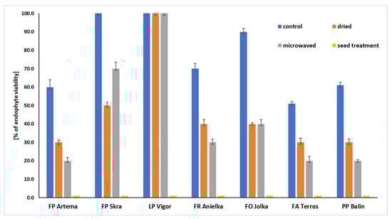 Figure 3. Endophyte viability after application of selected elimination methods. Bars indicate standard deviation of means. Description of elimination methods: control—initial endophyte viability; dried—storing seeds in a forced air circulation laboratory drying oven at 38 °C and 50% humidity for 5 days; microwaved—exposing seeds to microwave radiation at 90 W for 10 min; seed treatment—applying seed treatment Raxil Gel®.